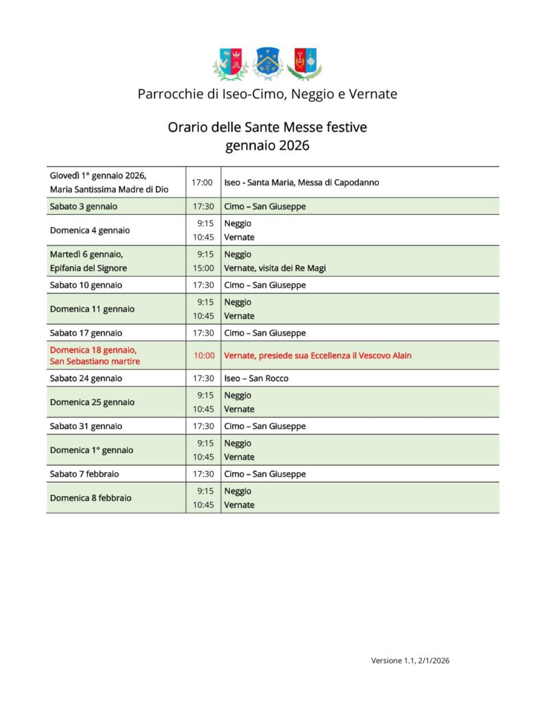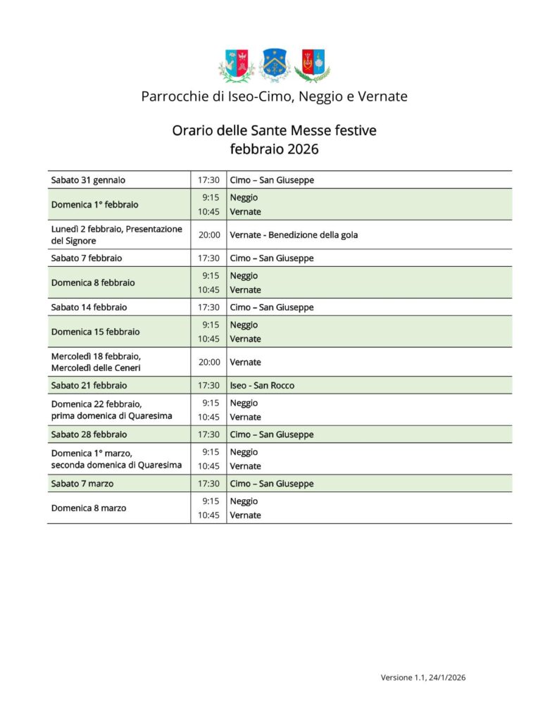 Orario delle Sante Messe festive per il mese di febbraio 2026